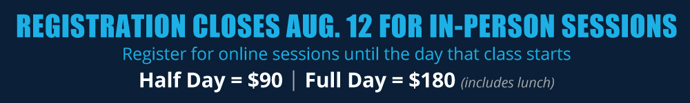 IMPORTANT NOTE: Registration closes early for in-person sessions. You may register for an online session until the day that class starts. There will be no on-site event registration.